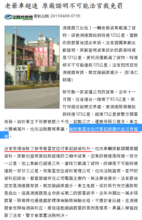 瑞奕汽車精品 時間: 2011-4-6 09:57 PM 標題: [新聞]老爺車超速!! 衛星定位行車記錄法庭佐證!!