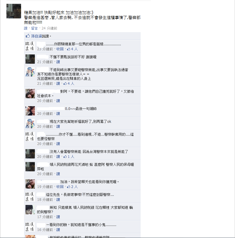 警察沒有錯,是這個社會病了,價值觀是非顛倒,包括連那些學者也只會迎合大眾,生病的社會。可憐的警察,不做事錯就算了,因為真的領薪水不做事是錯的,可是做事卻也是錯的,真的是悲哀。