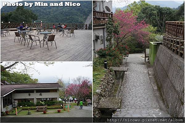 (左上)峽谷Bar: 晚上有音樂演奏, (左下)餐廳: 早/午/晚餐都是在這裡享用. (右)蘭馨樓和峽谷Bar中間的步道