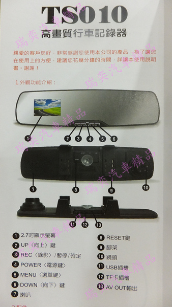 瑞奕汽車精品 時間: 2013-10-18 12:35 AM 標題: (停售)1080P 後視鏡型 最經濟的價格 OEM產品