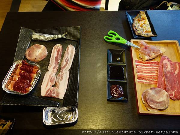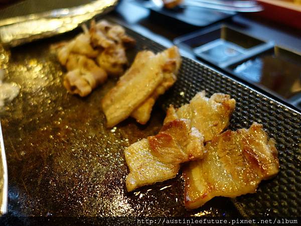 烤盤裡有厚的豬五花,豬梅花,包起來的是秋刀魚,