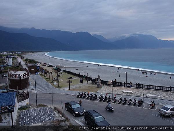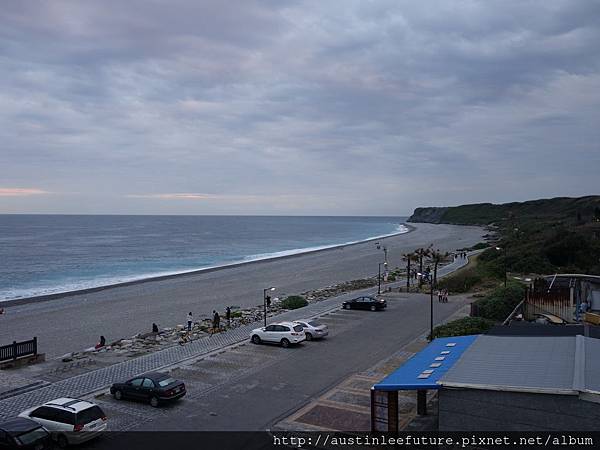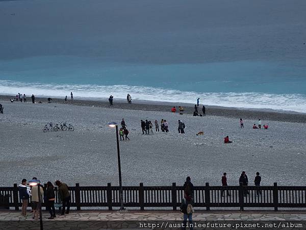正前方鵝卵石海灘上還有遊客在散步戲水