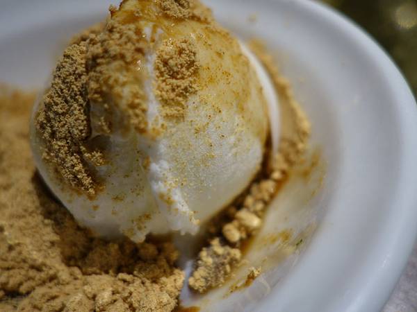 一球冰淇淋,淋上黑糖醬,再灑上黃豆粉
