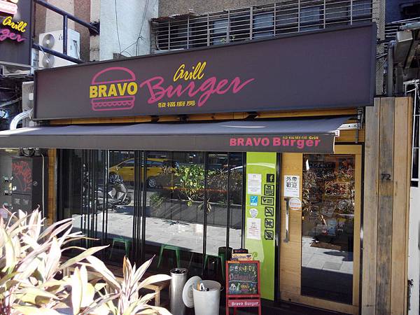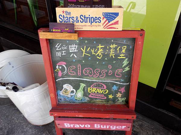 門口的小黑板標明了他們的主打商品 "火烤漢堡"