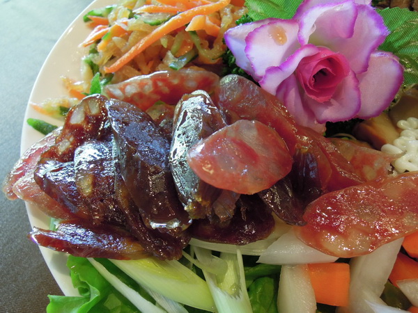 古店自製的肝腸與臘腸,搭配青蒜吃風味不錯,