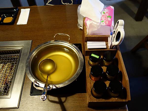 小小的鍋子,桌面內嵌的電磁爐,旁邊有調味料跟剪刀