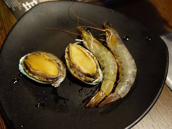 店家特別贈送的小鮑魚(九孔)跟蝦,還有小紅扇貝