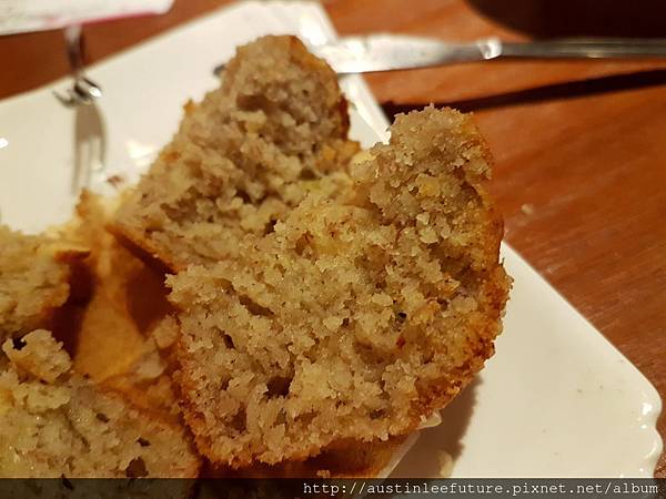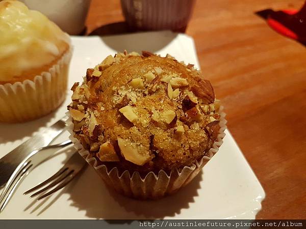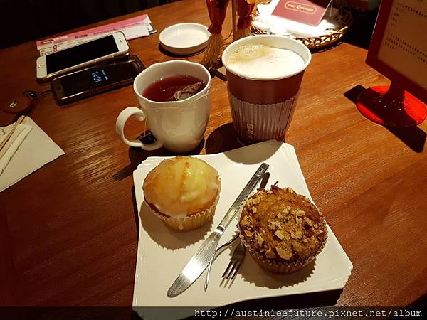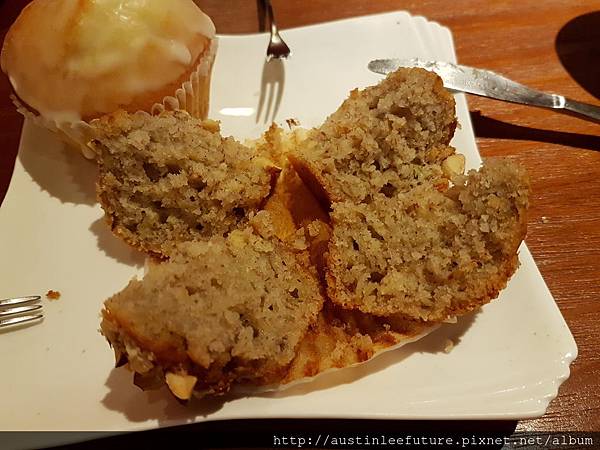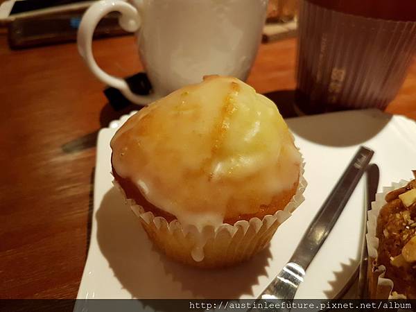 先送上瑪芬以及飲品,飲品選擇茶類及咖啡拿鐵,瑪芬選擇香蕉堅果及檸檬糖霜