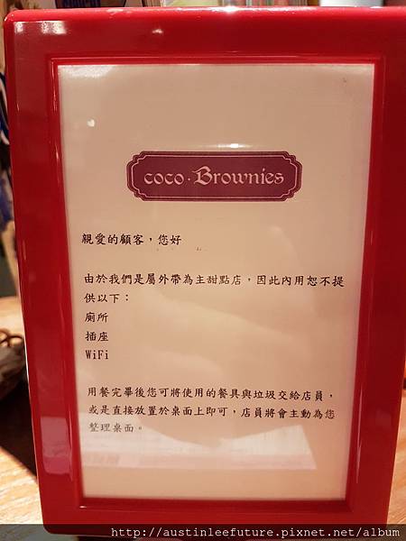 店家的廣告看板展示了一般提供的主要布朗尼款式,但口味還是要看當日店家提供的品項為主