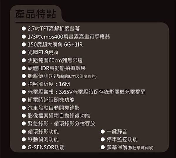 1080P 具硬體 HDR 高動態拍攝效果 及 胎外式胎壓胎溫偵測器功能