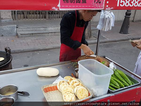 這東西其實台灣也不多見的樣子,說真的兩攤都很好吃,只是一攤大一點點也貴一點點,口味輸一點點,但也是很好吃的!有到天津這附近可以買來當早餐吃,真的不錯吃歐!我想台灣應該不容易有一樣價位的純手工肉夾饃,畢竟又要自己做饃,還要剁肉切蛋切饃組裝,也真的辛苦,在台灣要一樣的東西的話,老闆應該要賣五六十塊以上才願意吧.....