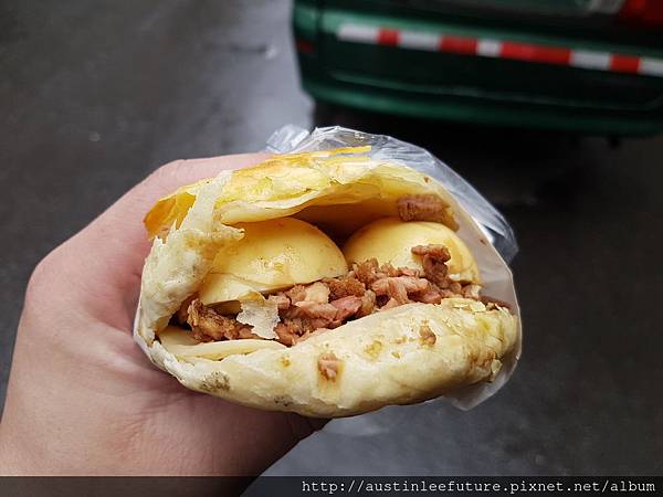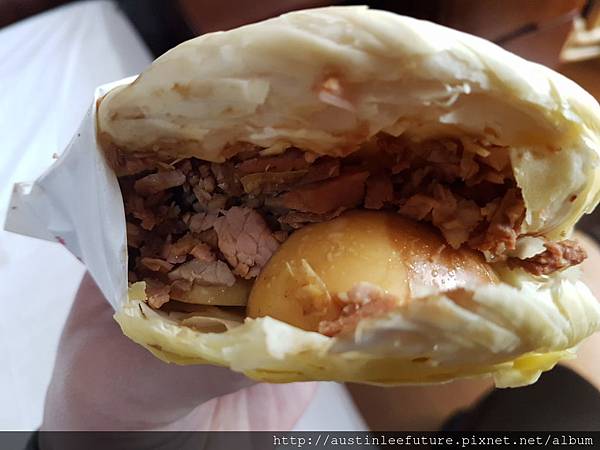 內部包著滷蛋、加了滷汁的碎滷肉,整個咬下去很充實又香,真的是一口接一口