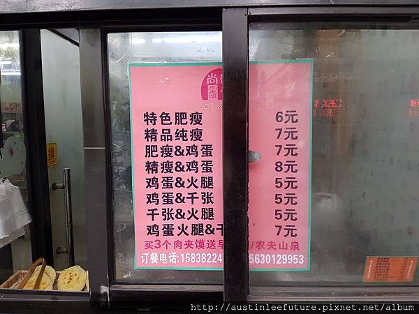 陝西特色肉夾饃,肥瘦5塊人民幣,純瘦6塊人民幣,加滷蛋多加1塊人民幣