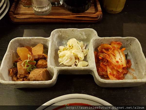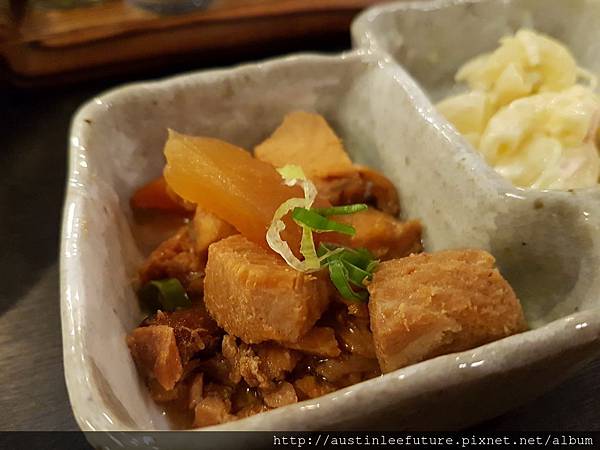 三種小菜裡,這種是魚類的肉品以日式醬油燉煮的小菜,味道還可以,魚肉稍微乾柴一點