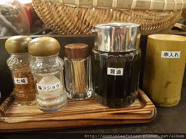 桌面上的調味罐以及竹籤丟棄桶(應該是吧)