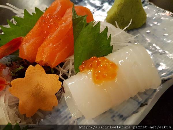 軟絲跟鮭魚上方都有鮭魚卵點綴