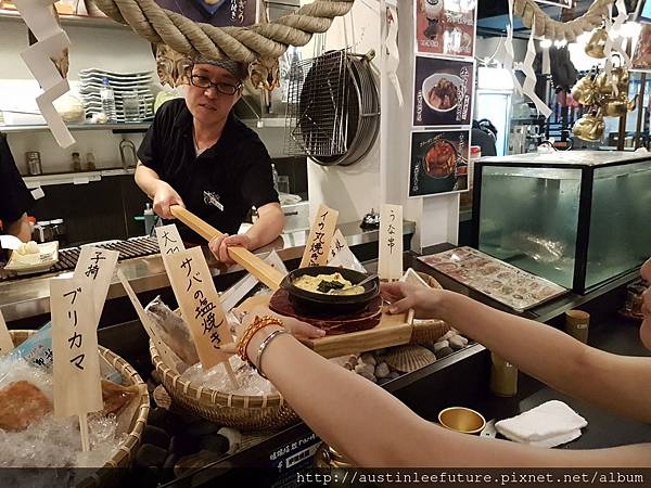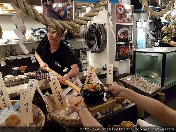 爐端燒的特色就是在吧檯前會使用船槳送菜