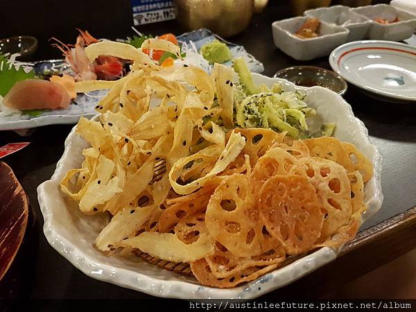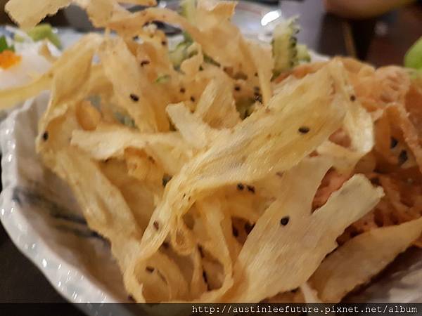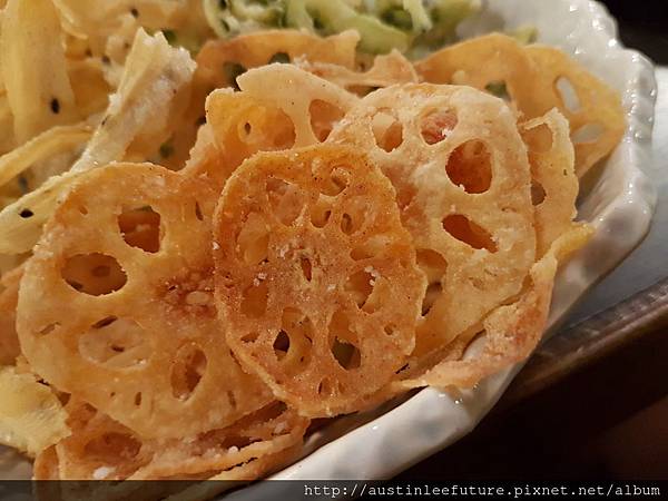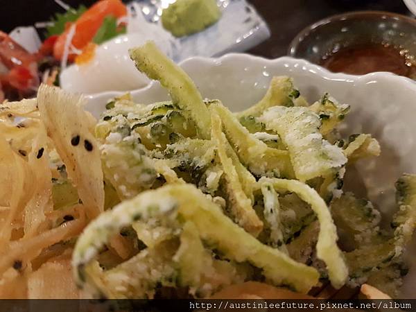 這炸野菜,雖然第一時間覺得很多,但吃到最後居然被我慢慢吃完了!其中不得不說那山苦瓜,我以往是不吃苦瓜的,也沒吃過山苦瓜,但是這次我第一次嘗試了一片,不會苦耶!還有一點點帶有回甘的味道,我甚至覺得比牛蒡的苦味還低,讓我一片接一片,所有山苦瓜都是我一個人吃完的哩!