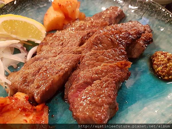 厚切無骨牛小排,配上洋蔥絲+泡菜+醃蘿蔔+芥末籽