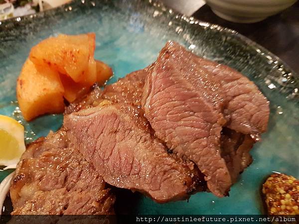 內部大約是七八分熟,個人覺得有先醃製調味過,有甜甜的醬香味,肉質軟嫩牛香味濃郁