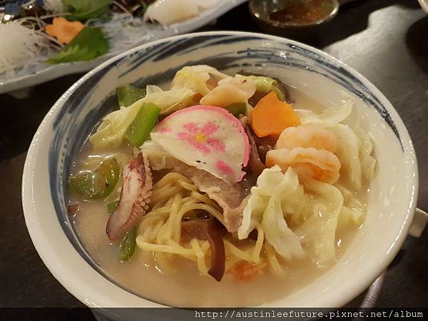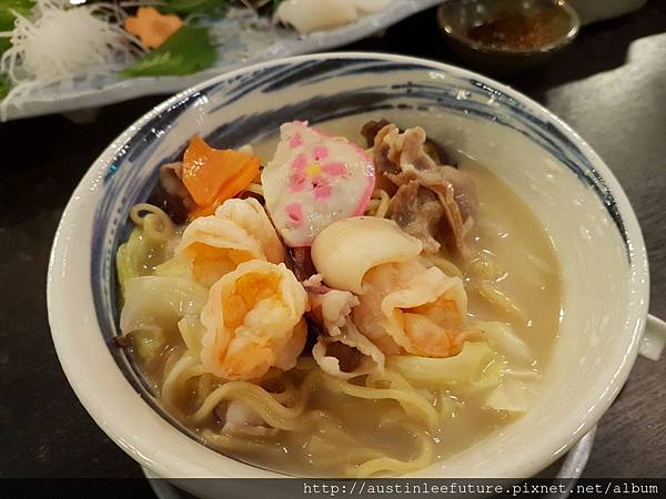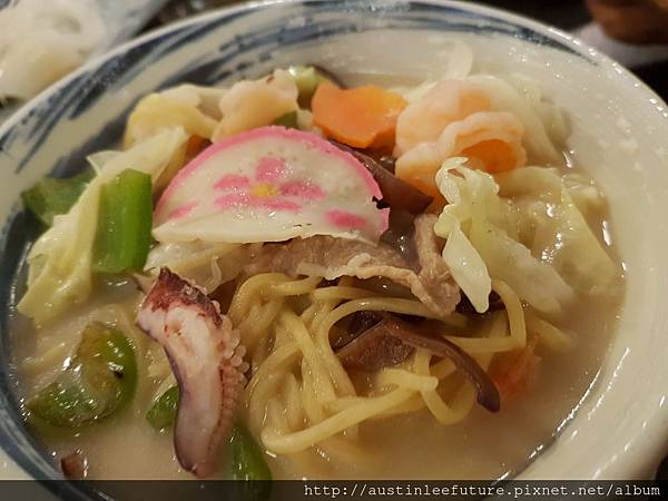 裡頭大蝦子好幾隻,又有花枝與豬肉片及魚板,然後還有煮到香軟的高麗菜搭配一些我討厭的青椒 XD