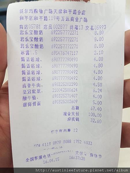 這是2016年4月這次再到這間沃爾瑪瘋狂採購的收據,買了一堆酸奶、沐浴球、泡麵跟水果,反正每次來天津住津海公寓都會來沃爾瑪採購