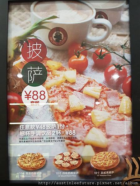 這家太平洋咖啡還有比薩,一個10吋比薩搭兩杯咖啡賣88元人民幣,約440台幣的價格