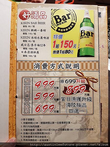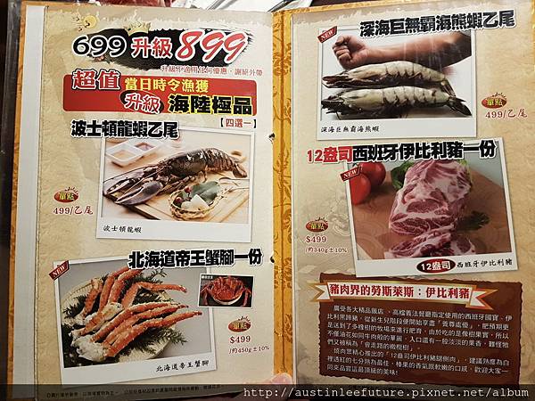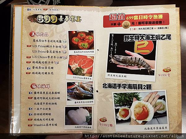 首先看看這次的體驗內容,是 699豪華饗宴,加1塊錢可以海王蝦一尾或是海扇貝兩顆選一種