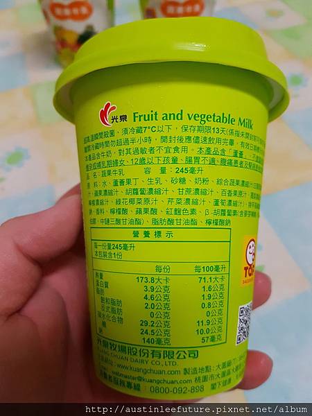 實際喝起來的感覺,各位可能會想跟果菜汁一樣的味道?不是呢,喝起來的感覺不錯,尤其是其中的百香果味道還滿搶戲,所以我覺得比較偏百香果味道一點的風味牛奶,加上裡面蘆薈果粒的QQ口感,還真的滿好喝的。昨天到便利商店有看到架上已經在販售這一款蔬果牛乳了,有想要嘗試一次補充十種蔬果能量的朋友可以去買來試試歐