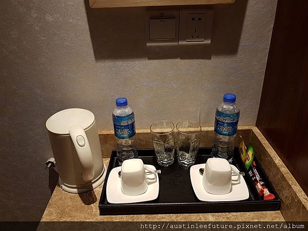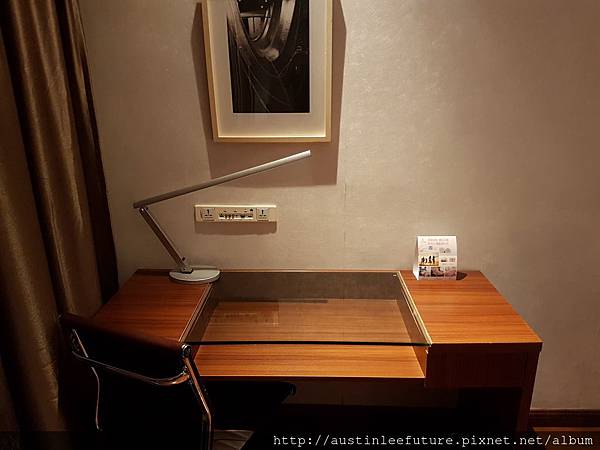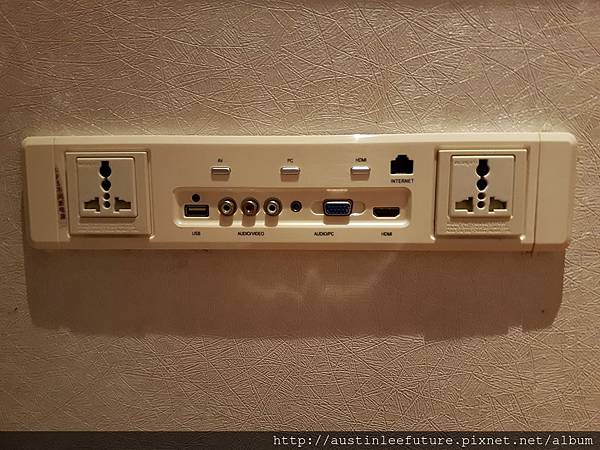 牆上還有萬國插座以及各種連接電視螢幕的端子及網路還有USB,算是提供很健全的商務機能了,且房間內有免費無線網路,不過,畢竟是在中國境內針對中國旅客的房間,網路一概在牆內是不用懷疑的
