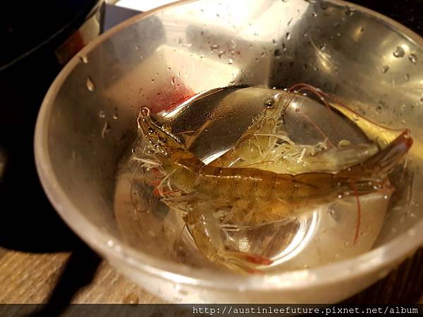 原來是活跳白蝦,真的是活跳跳,一定要用盤子壓好