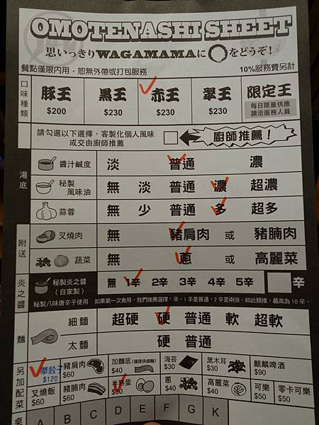 點單上可以看到,我個人是選擇赤王,不敢太辣,然後喜歡吃硬一點的麵,加了一顆半熟蛋,以及加點拳餃子跟同事一起吃看看