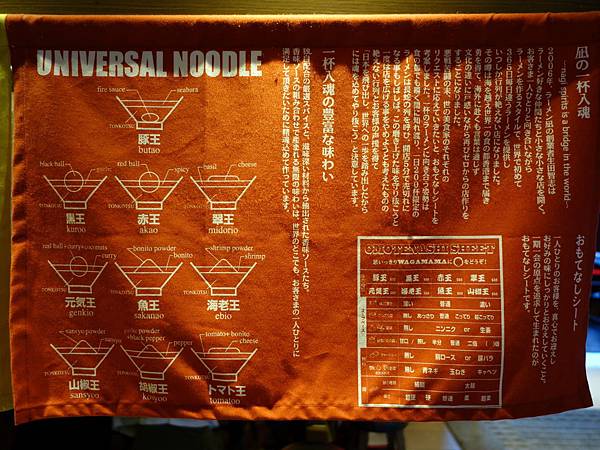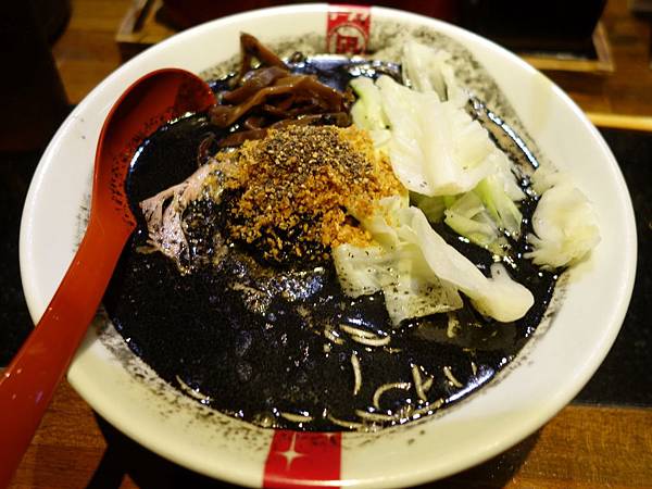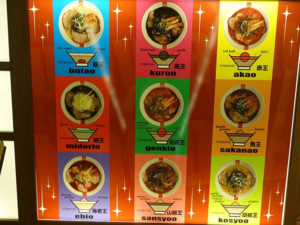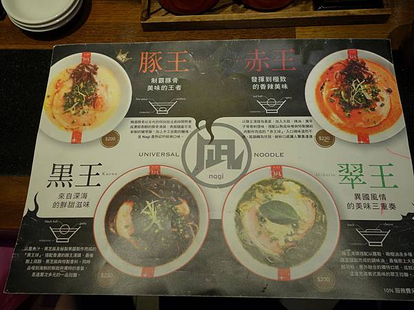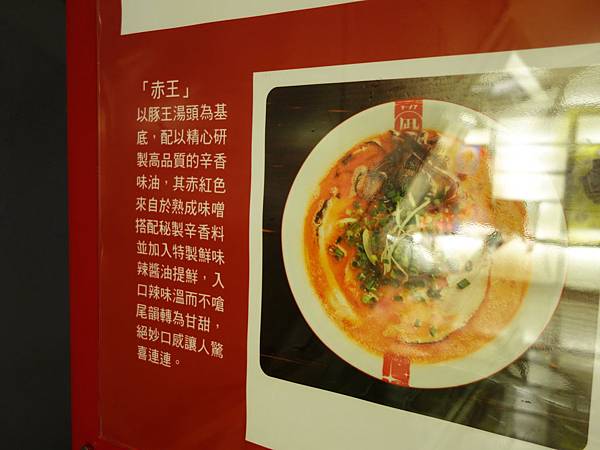 像豚王就是濃郁白湯的豚骨拉麵,黑王是豚骨湯再加上墨魚汁以及黑芝麻還有特調黑醬,調出來的黑色湯頭,赤王則是豚骨湯頭為基底加上辣油及大蒜還有唐辛子等調製出的辣味湯頭,翠王則是豚骨湯頭加上羅勒及橄欖油還有起司粉,調製出的義式風味
