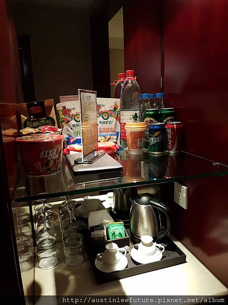 這裡沒有冰箱,所以迷你吧檯上擺放了飲料及零食,上半部是要付費的