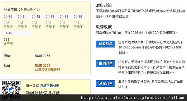 可以看到每日的價格是含早餐的 298人民幣,周末比較貴要 388人民幣,不過後續轉換住到另一間旅館,所以實際上僅住到周五就是了