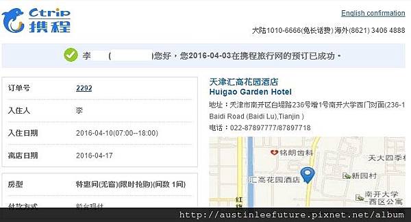 攜程在大陸算非常大的一家網路旅行社業者,代訂機票酒店這些都很齊全,這次的訂購不需要線上付款,只有先預扣一日的額度以免客人放鴿子,實際的款項也是到了酒店登記入住後再處理,所以非常方便