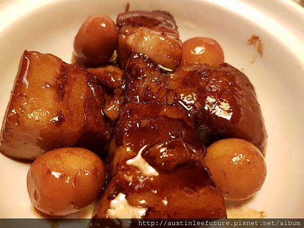 有配上滷到入味的鵪鶉蛋,滿好吃!四塊肉本身是肥瘦各半左右,怕肥的可能要自己把肥肉部分弄掉,但整體調味很棒,甜甜的醬香配上滷到柔嫩的肉,是很開胃下飯的一道菜,只是份量不大每個人就一塊