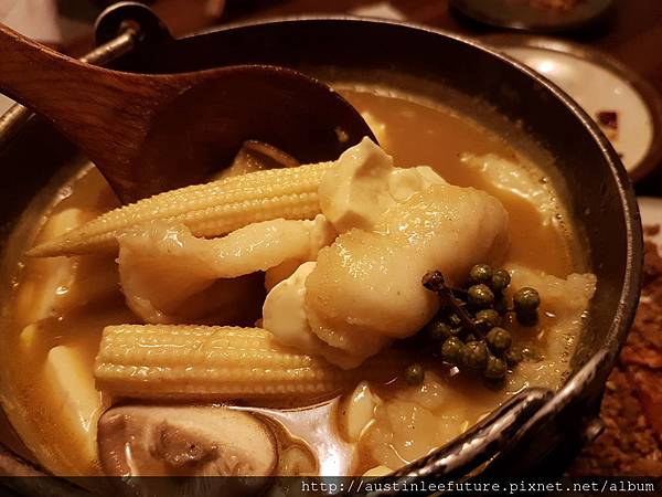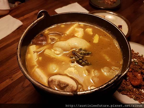 裡頭的料滿豐富,一小鍋分作四人份剛好每人一小碗,喝起來鹹香微辣,很有意思的味道,滿好喝
