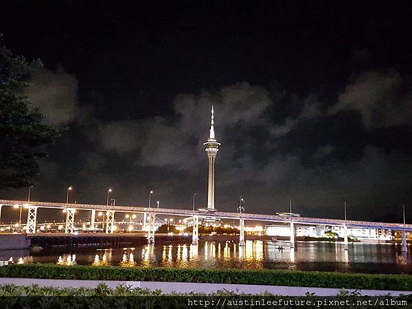 左方南灣湖的夜景也很美,可以看到澳門旅遊塔與嘉樂庇總督大橋(澳氹大橋)