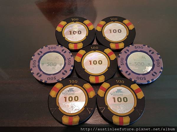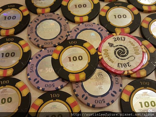 講這麼多廢話,重點就是,我這裡拿的 500元籌碼,本來玩骰子輸,剩 300元時轉戰輪盤,照我上面的作法,逐漸贏到滿手都是 25元籌碼(這個小籌碼只限在該輪盤桌使用,要離開需要換成正式的 100元籌碼),估計手中的籌碼有超過 2000元
