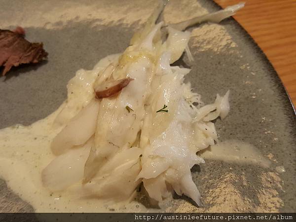 很威的辣汁燴龍蝦鉗與水煮龍利魚(台灣人稱的比目魚,扁鱈)