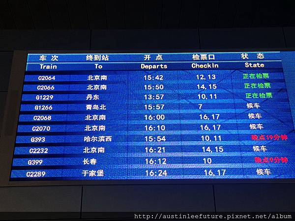 這些 G 與 C 開頭的都是高鐵,還是會有誤點的情形,因為前一天才降下中國北方的 2015年第一場大雪,不只鐵路交通大亂,連航空交通也是亂糟糟