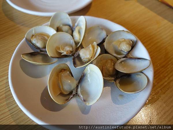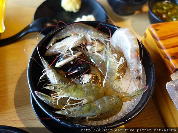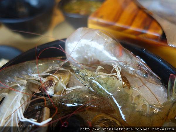 本來要蓋蓋子的活跳蝦,放了一會兒後就比較沒有活動力了,蝦子下面還有蛤蠣,活的