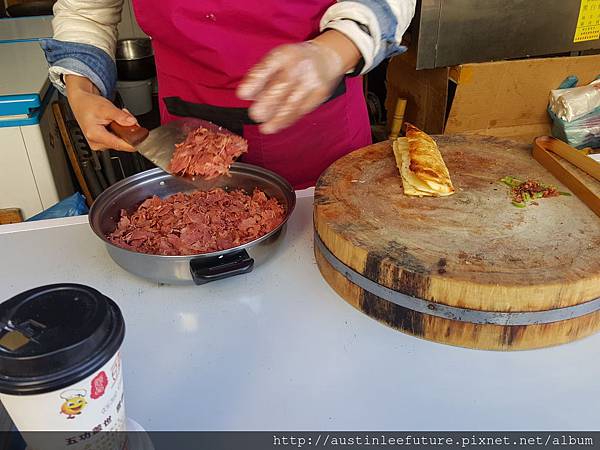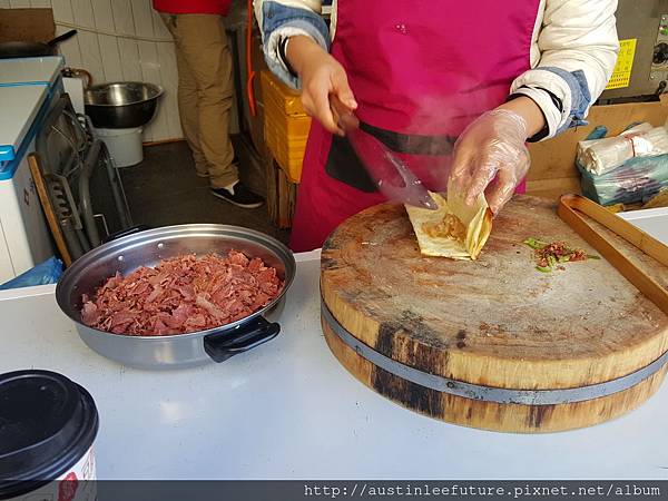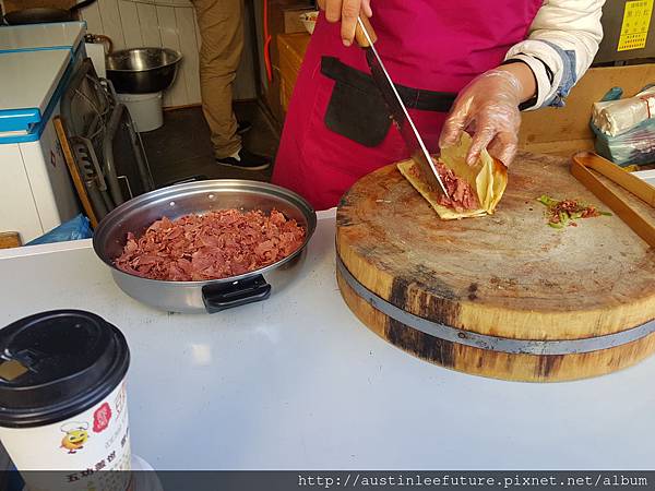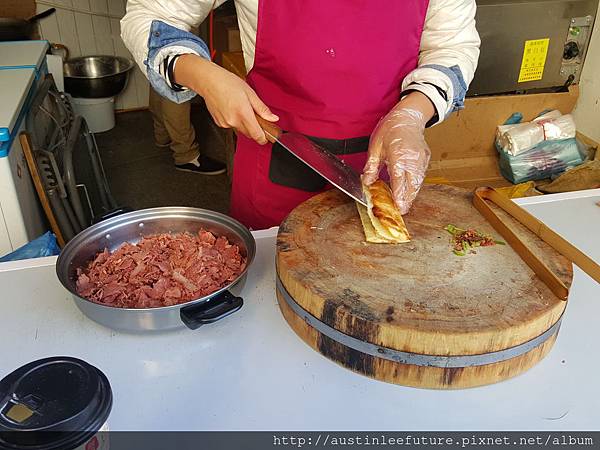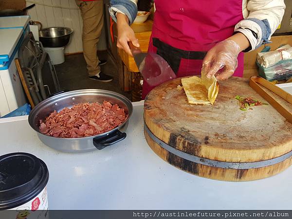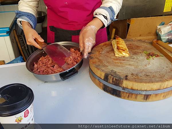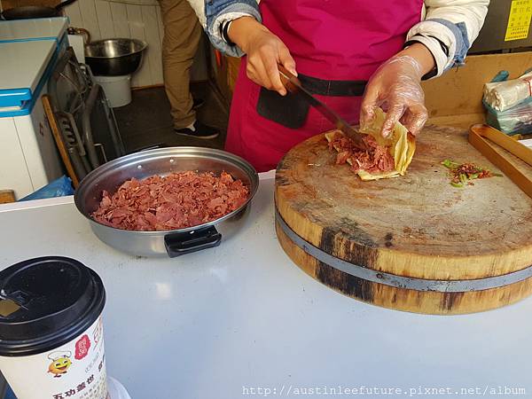 8塊錢人民幣說真的不算貴,畢竟裡面肉滿多又很好吃,為了寫這篇文特別上網看了看,台灣人好像寫這驢肉火燒的分享並不多,但還是有找到,原來火燒與燒餅的不同在於麵粉有沒有發過,沒有發過的是火燒的作法,發過麵的被稱為燒餅