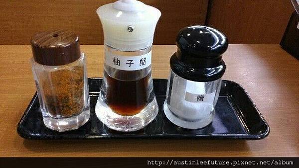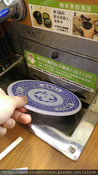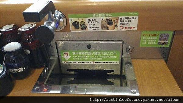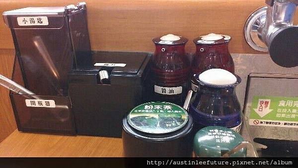 桌上的東西,特別的是提供抹茶粉末,右上方就是跟多數迴轉壽司一樣的熱水水龍頭