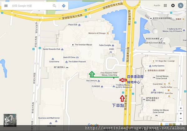 上圖,下車點就是剛剛提到的連貫公路/威尼斯人公車站,下車後稍微往北(威尼斯人酒店方向)走一點就是四季酒店,四季酒店與威尼斯人酒店的購物中心有相連,這麼熱的天當然就逛逛精品購物中心吹吹冷氣走回去威尼斯人比較好(就是綠色的動線)