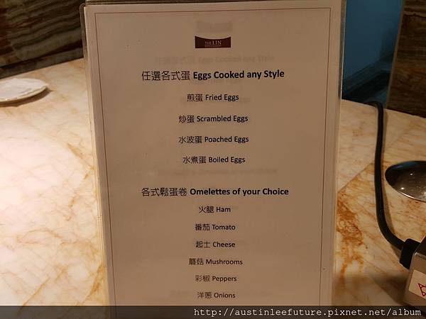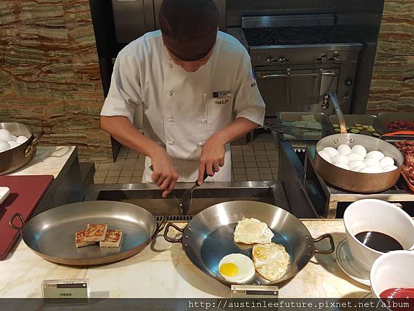 因為早上沒啥人,所以,身為幾乎是第一桌也是唯一一桌的客人,旁邊就站了一個服務生一直盯著我們服務(是沒有直瞪著啦),我想依照林酒店的自助餐廳訓練,應該是設計一個服務人員要顧幾張桌子幫忙服務或清理桌面,只是都沒人只有我們這一桌,所以服務人員就直接在我們附近專屬服務了