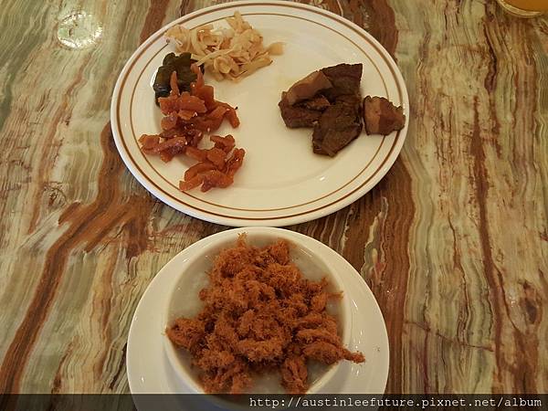 吃粥可以配的小菜,由左至右是蔭瓜,筍絲,豆棗及肉鬆,都是白粥好夥伴