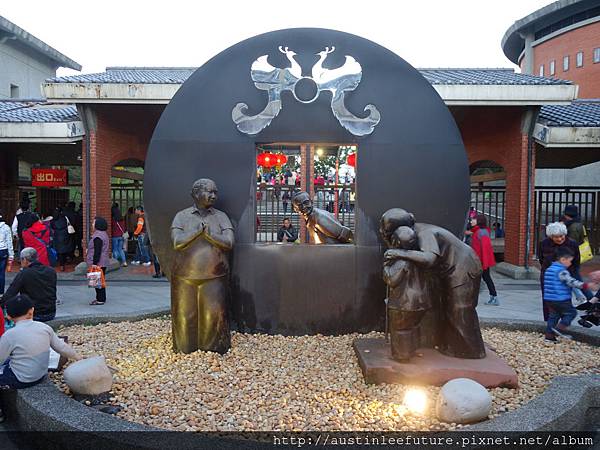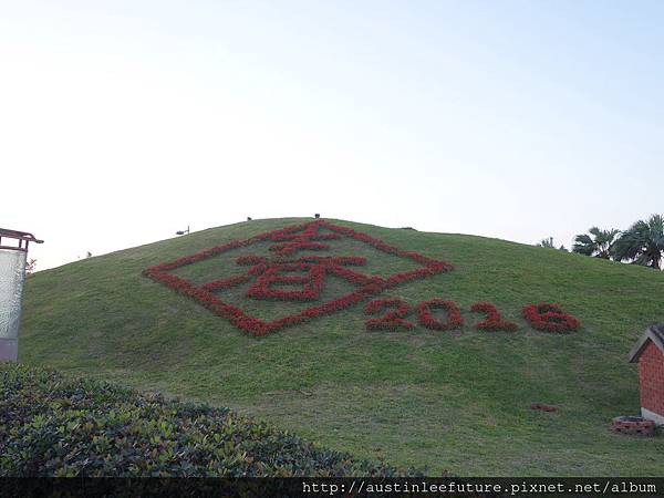 由外圍入口處往傳藝園區中前進,有的小土地公廟與草皮上用聖誕紅種出2016年春的字樣