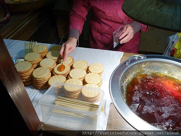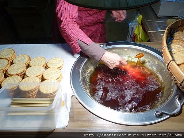 很單純樸實的點心,用竹籤沾一丸麥芽糖,直接黏在兩塊餅乾之中就完成了
